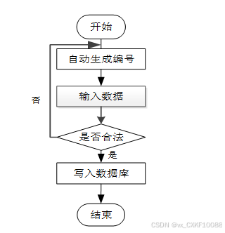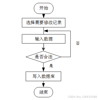 用户首先选择需要修改的记录,输入修改后的数据,系统判断输入数据是否合法。若数据不合法,提示重新输入;若数据合法,则将修改后的数据写入数据库,完成操作后流程结束。修改信息流程图如图4-4所示。