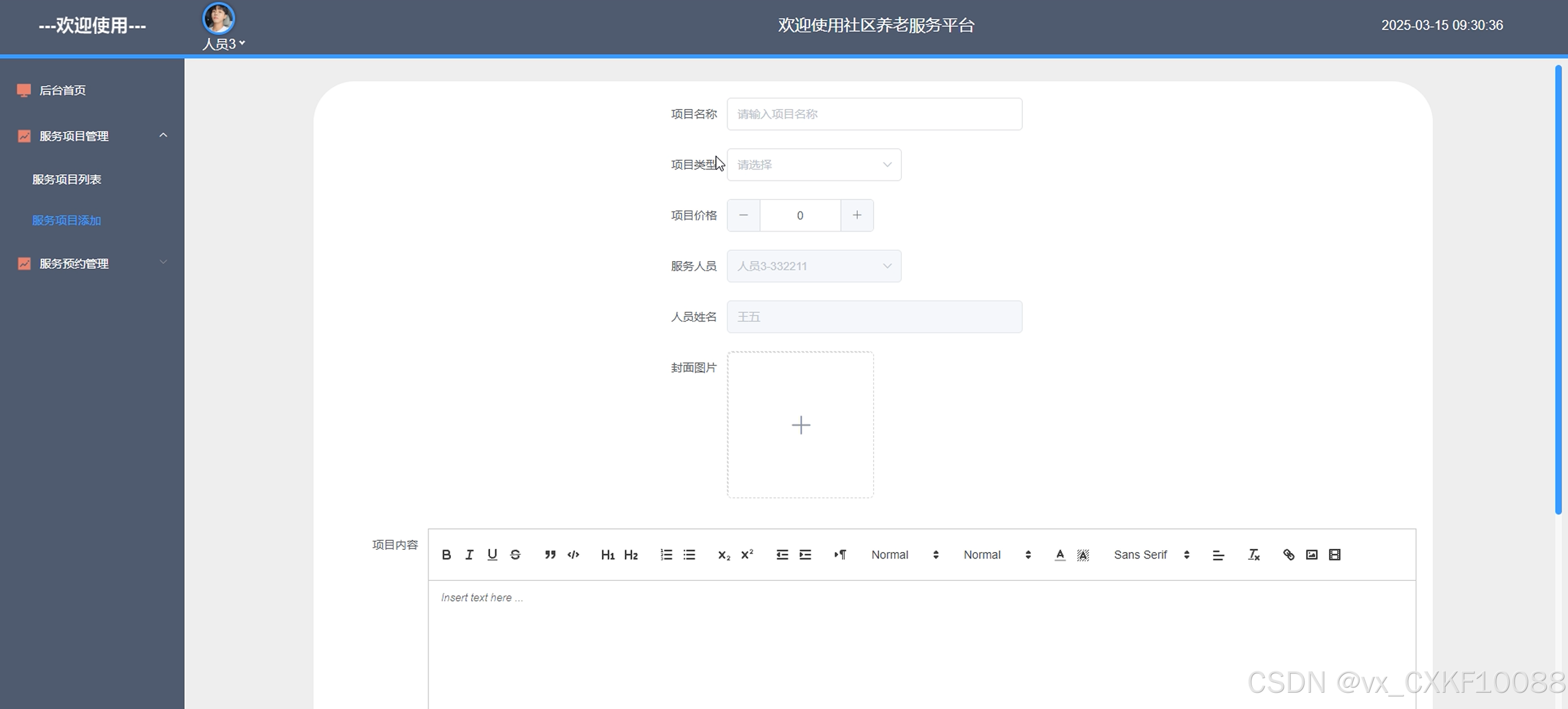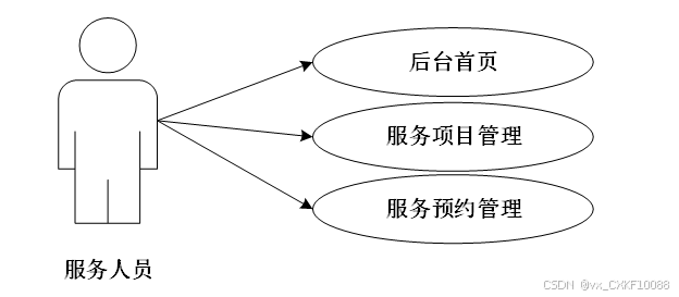 服务人员:后台首页、服项目管理、服务预约管理等功能。