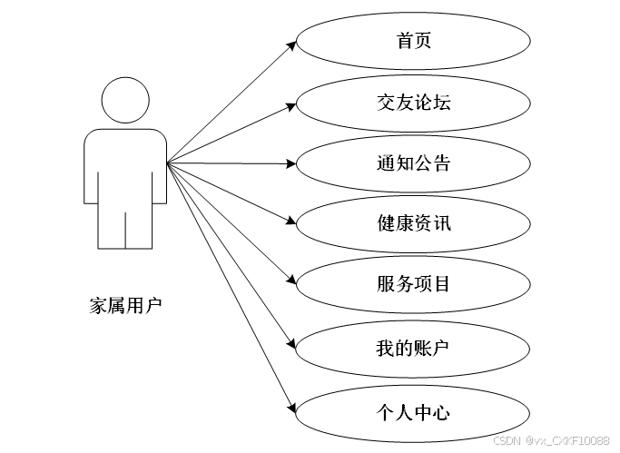 家属用户:首页、交友论坛、通知公告、健康资讯、服务项目、我的(个人首页、老人用户、健康记录、服务预约、交友论坛、收藏、评论管理)等功能。
