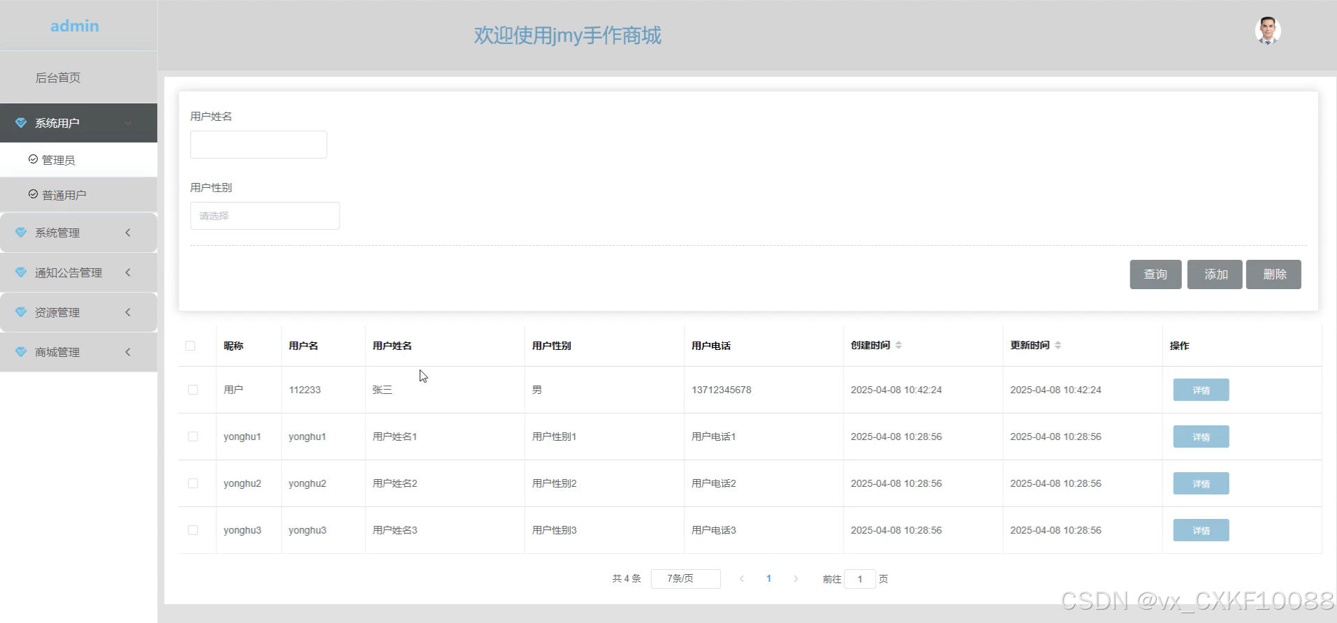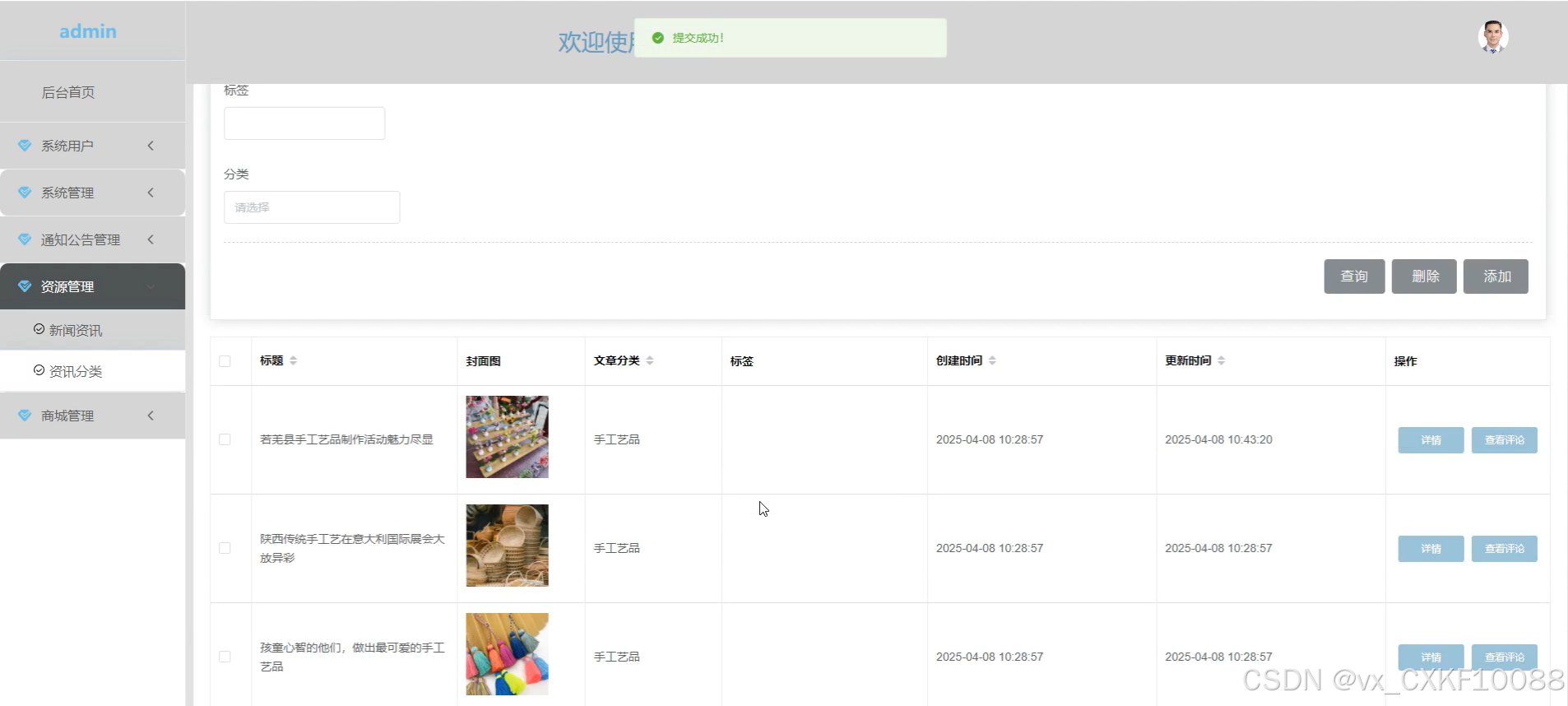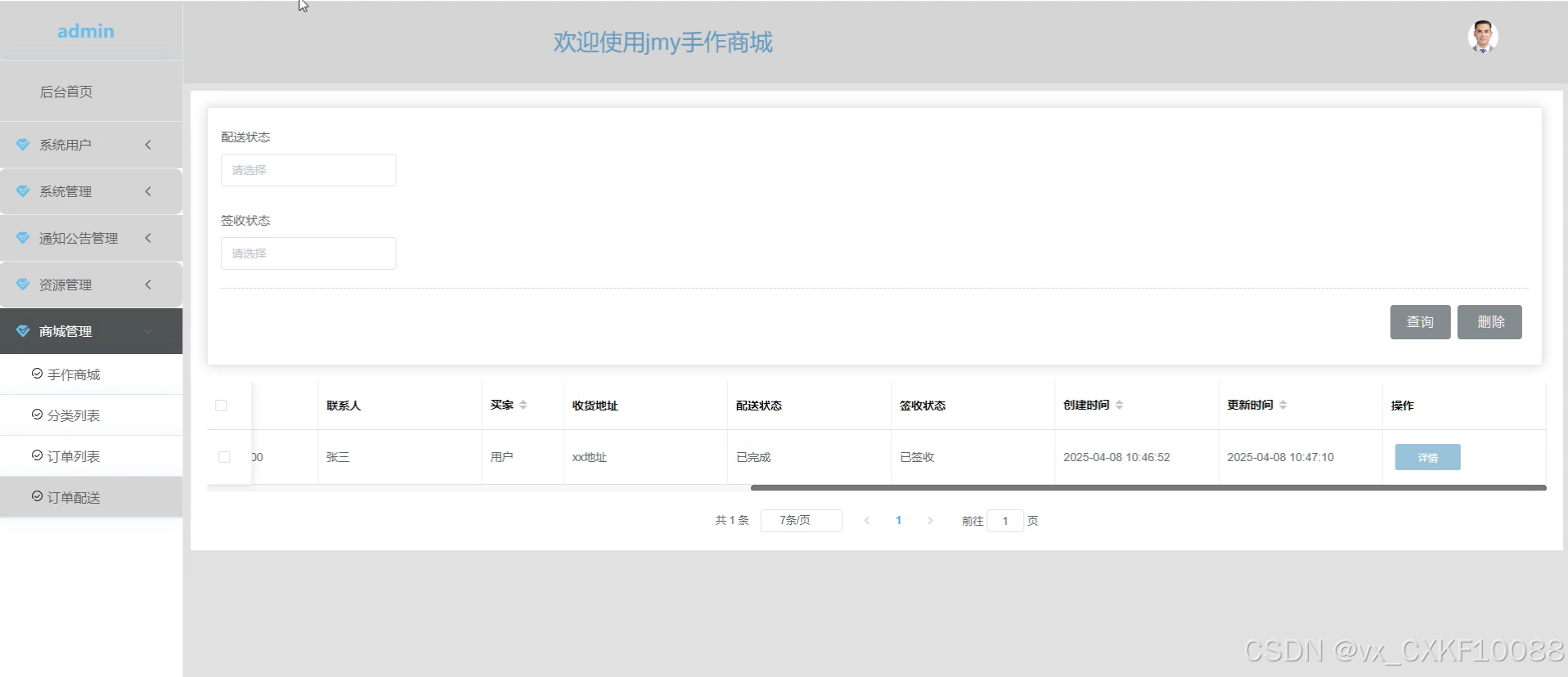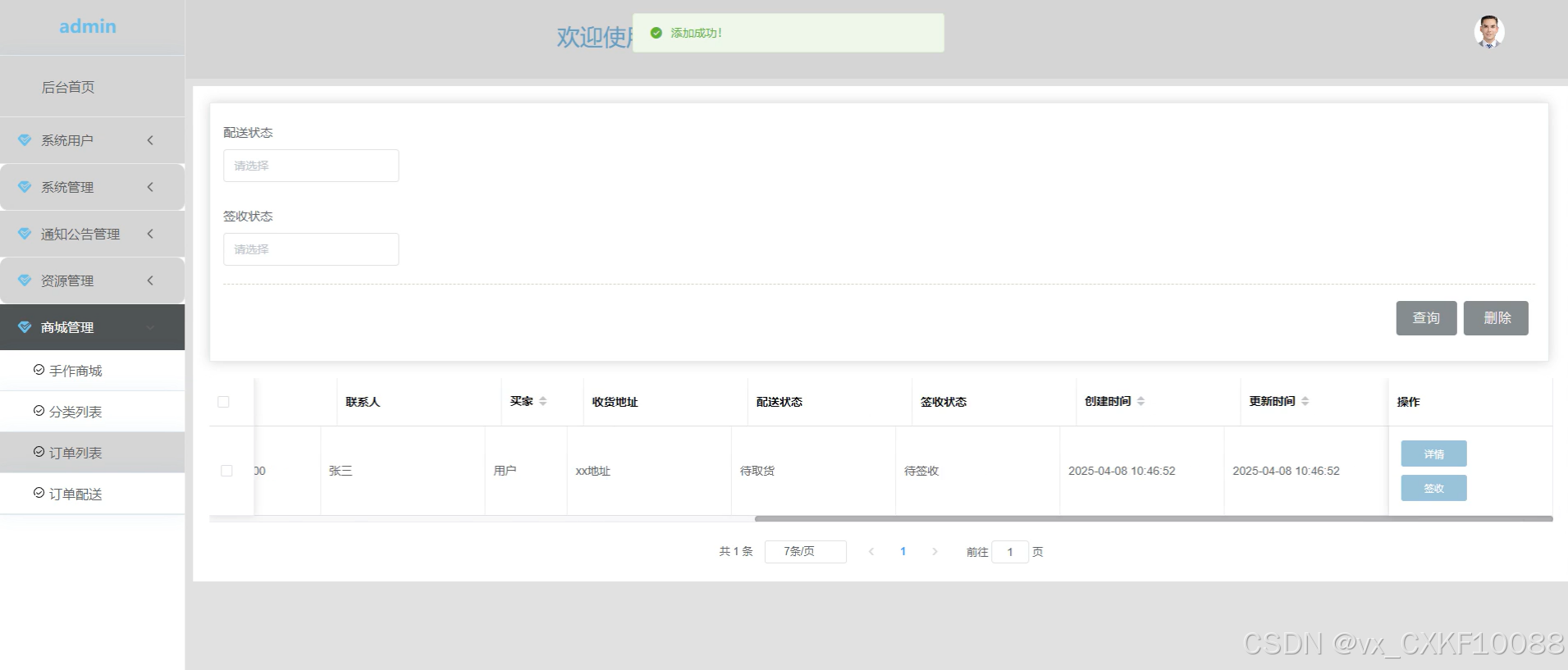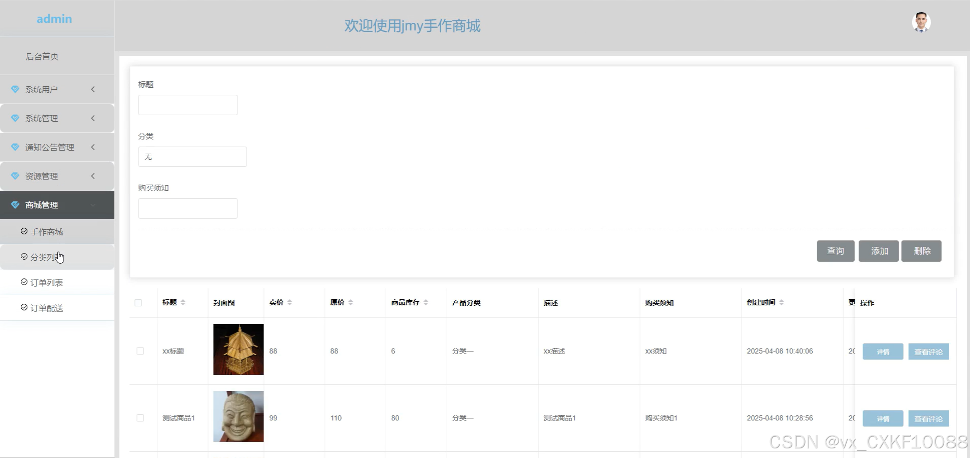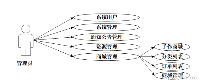 商城管理(手作商城、分类列表、订单列表、订单配送):管理员可以管理商城商品、商品分类、查看订单信息并处理订单配送,确保商家的商品和订单处理流程顺畅高效。