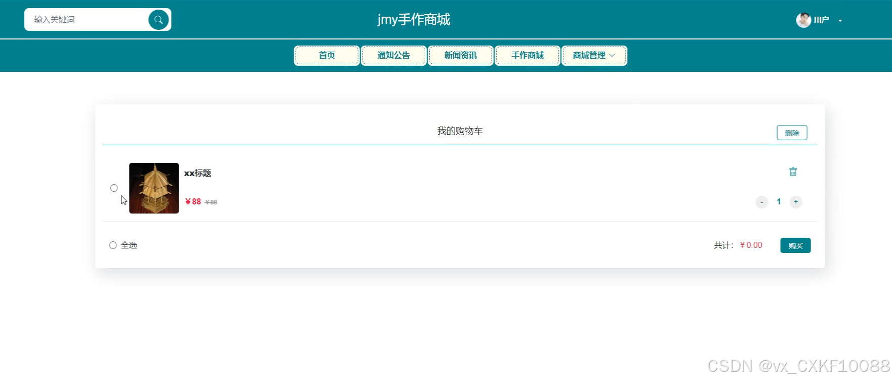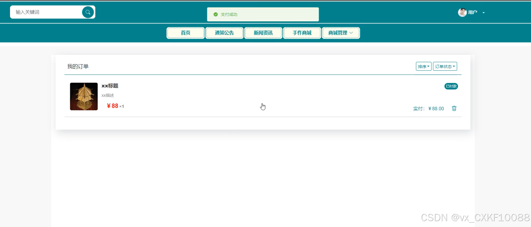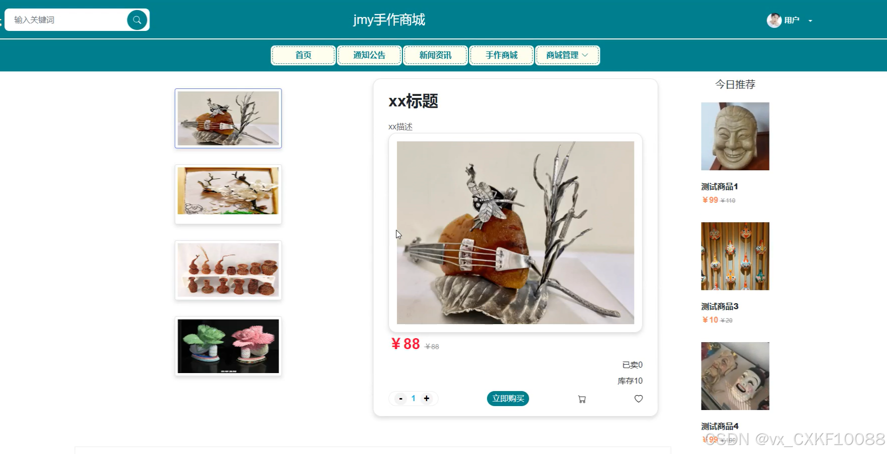 手作商城:用户通过商城浏览各类手工艺品,支持商品分类、搜索和筛选,便于找到感兴趣的商品,进行购买决策。