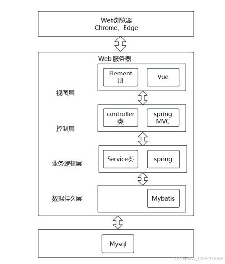 本项目采用B/S架构,遵循MVC设计思想,采用前后端分离的方式进行架构搭建。系统主要由表示层、控制层、业务逻辑层和数据层构成,系统架构如图4-1所示。