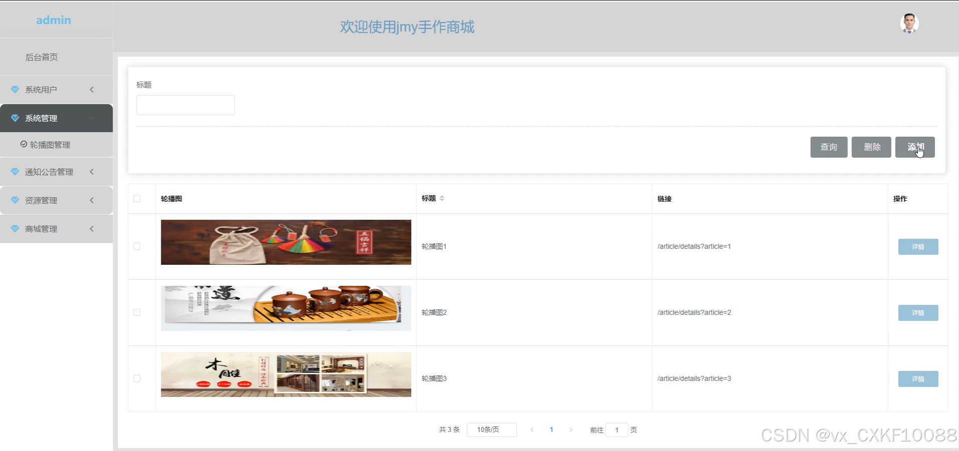 系统管理(轮播图管理):管理员可通过轮播图管理模块更新和维护首页的广告和宣传图,优化平台的视觉展示和用户引导。