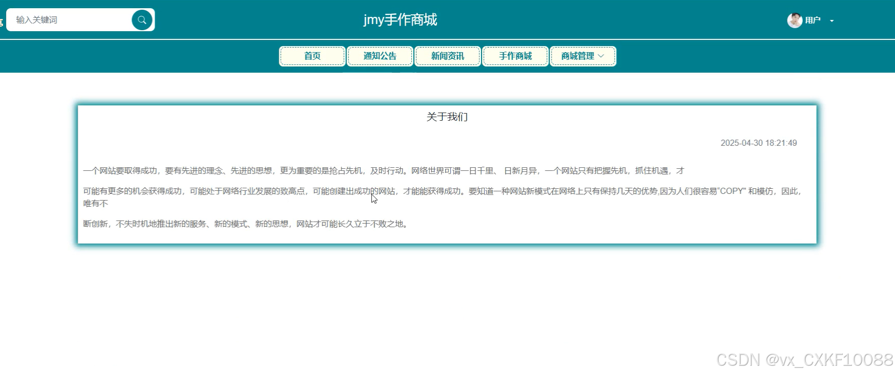 With the rapid development of e-commerce, the handicraft market is gradually shifting towards online, especially with the increasing demand for personalized and creative products. In order to meet this demand, this paper designs and develops a JMY handmade shopping mall system based on Java technology. The system aims to provide users with a convenient online shopping platform, supporting functions such as browsing products, placing orders, managing orders, and collecting products. At the same time, it provides administrators with backend management functions such as product management, order management, and user management. The system mainly adopts the Spring Boot framework for backend development, uses MySQL database for data storage, and uses HTML, CSS, and JavaScript for page design and interaction in the frontend, ensuring the system's response speed and user experience. In addition, the system also introduces a permission management mechanism to distinguish the different operational permissions of administrators and ordinary users, ensuring the security and efficiency of the platform. By optimizing the mall process and effectively combining technology, this system not only improves the shopping experience for users, but also provides convenient product and order management tools for merchants, solves the time and space limitations of traditional offline shopping, and promotes the digital transformation of handicraft sales. The system has been tested and proven to have stable functionality and a user-friendly interface, meeting the current market demand for online trading of goods by competitors.