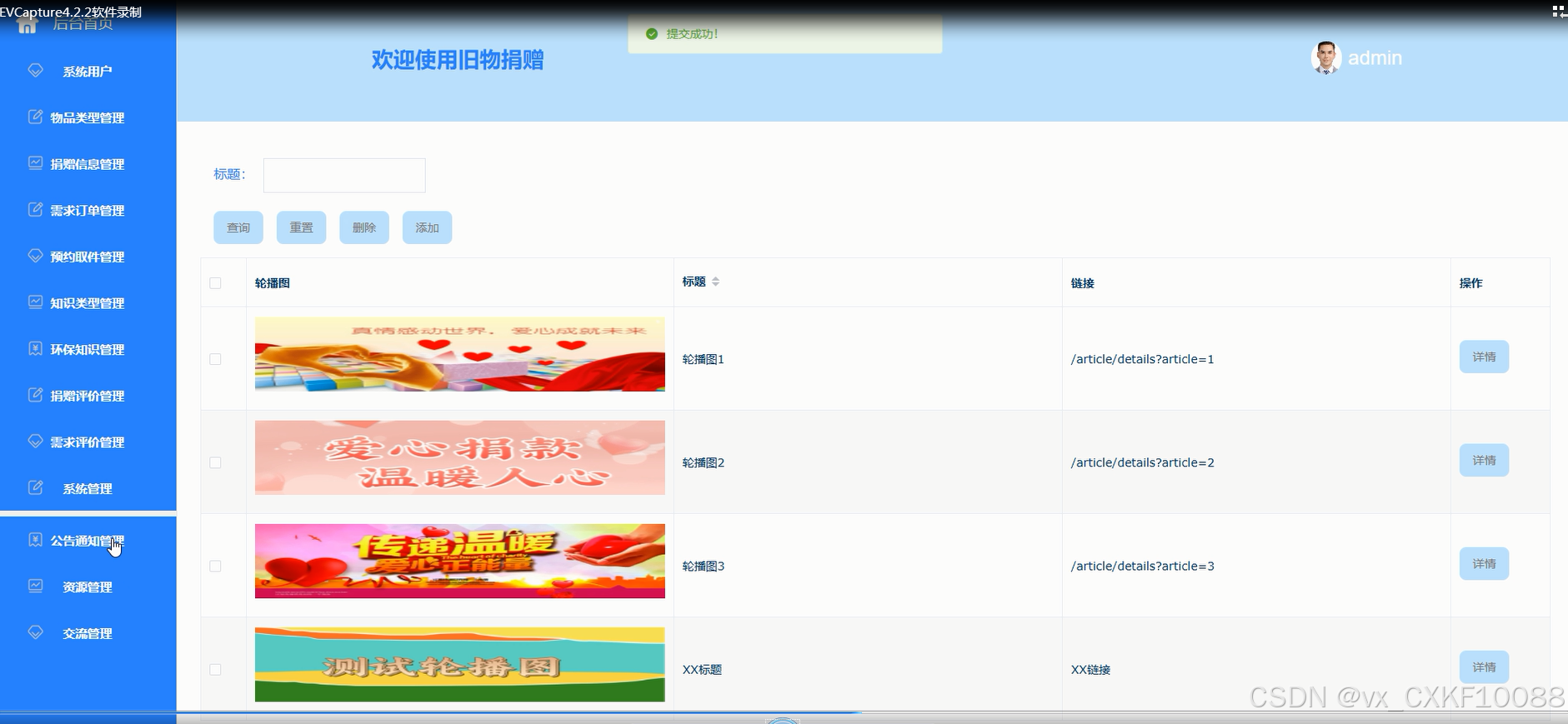管理员管理网站首页的轮播图内容,确保重要信息得到及时展示。添加、修改、删除轮播图:保证轮播图展示的信息与时俱进。系统管理界面如下图所示。