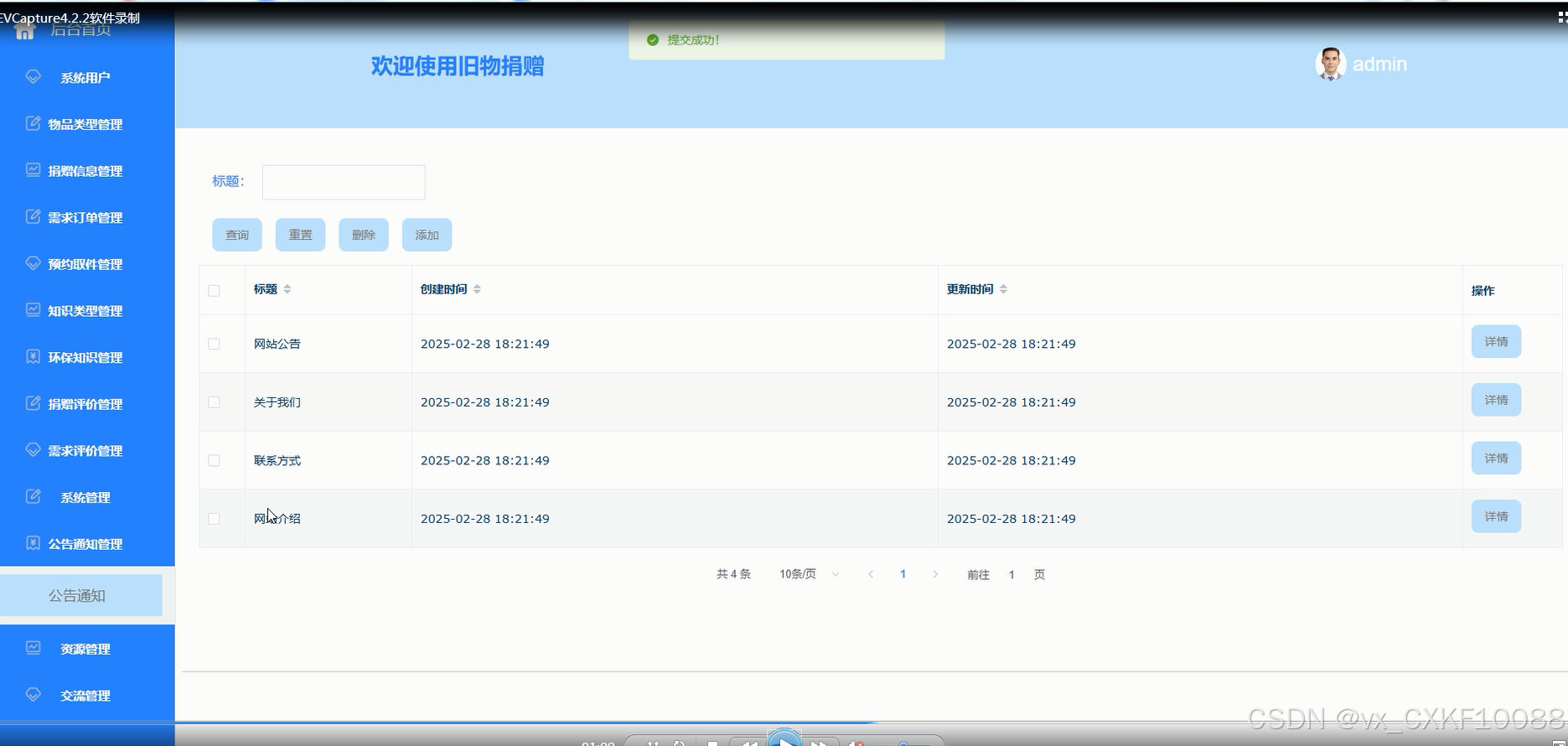 捐赠信息管理:管理捐赠用户提交的捐赠信息,包括物品信息、捐赠数量等。