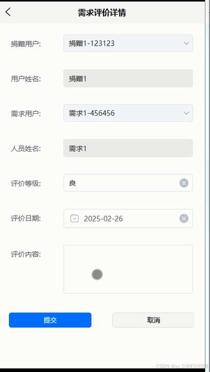 需求用户可以评价捐赠用户提供的物品质量与服务,需求评价界面如下图所示。