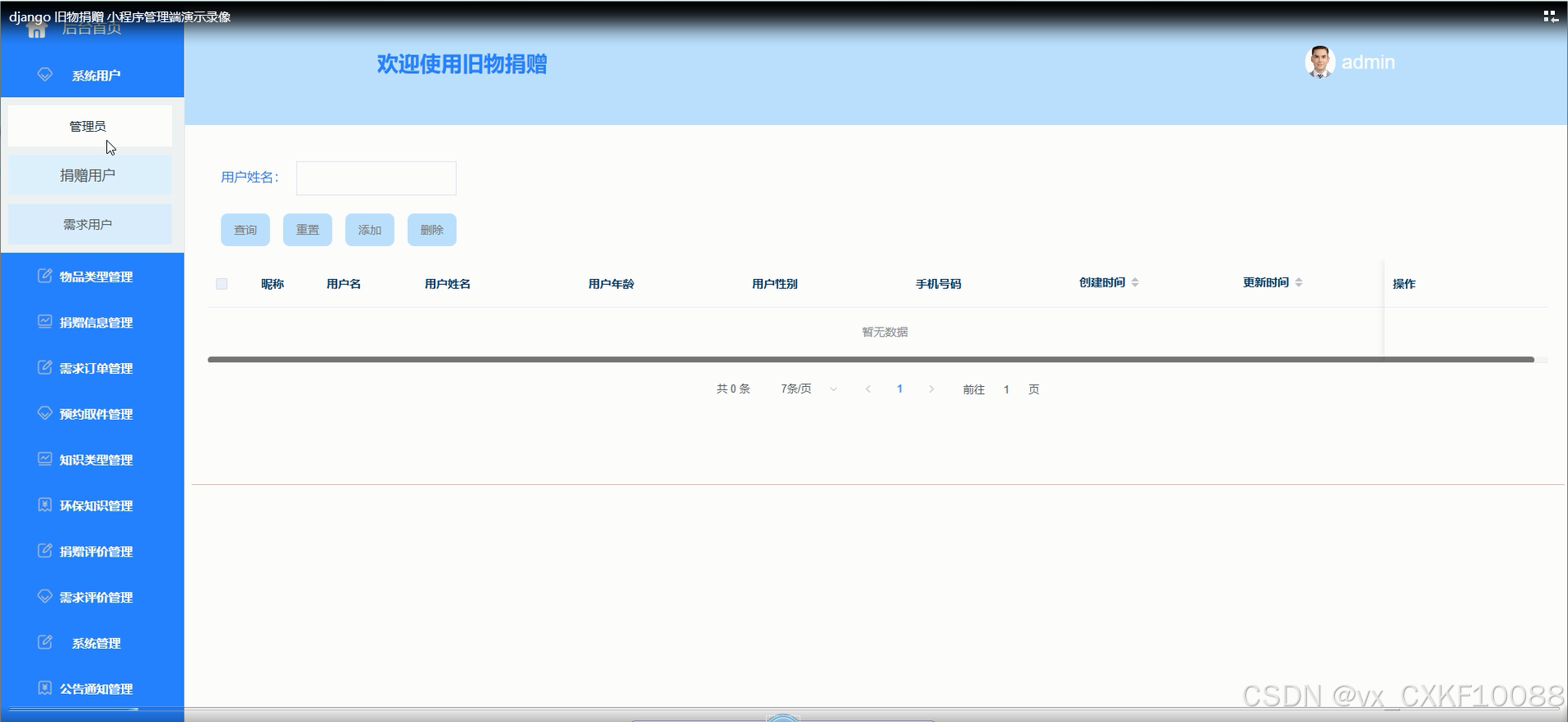 关键词:微信小程序;旧物捐赠;Django框架;系统设计;环保知识;