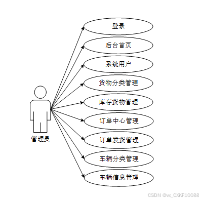 本冷链监控平台的管理员角色模块则涵盖了登录、后台首页、系统用户、货物分类管理、库存货物管理、订单中心管理、订单发货管理、车辆分类管理、车辆信息管理等功能。管理员角色用例图如下图3.3 所示。