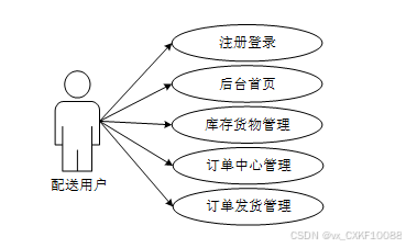 本冷链监控平台的配送用户角色模块主要包含注册登录、后台首页、库存货物管理、订单中心管理、订单发货管理等功能。配送用户角色用例图如下图3.1 所示。