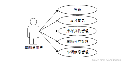 本冷链监控平台的车辆员用户角色模块含有登录、后台首页、、库存货物管理、车辆分类管理、车辆信息管理等功能。车辆员用户角色用例图如下图3.2 所示。