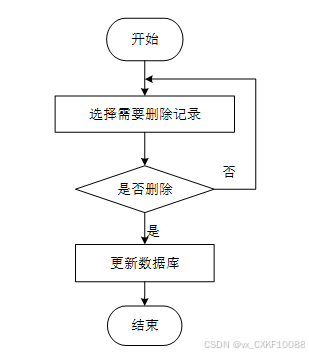 用户选择需要删除的记录后,系统判断是否确认删除。若未确认,返回选择环节;若确认删除,则更新数据库,删除对应记录,完成操作后流程结束。删除信息流程图如图4.5所示。