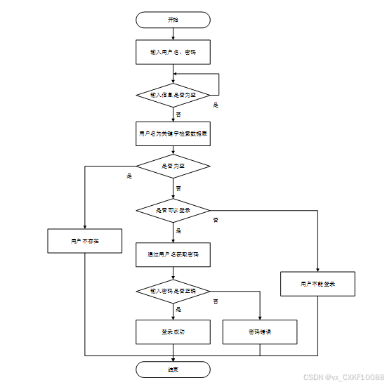用户输入用户名和密码后,系统先检查输入是否为空,再验证用户名是否存在,若存在则通过用户名获取密码并校验。若密码正确则登录成功,否则提示密码错误。若用户名不存在或无法登录,提示用户操作无效。如图4.2所示。