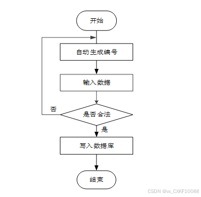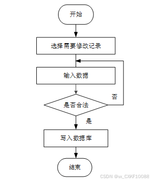 用户首先选择需要修改的记录,输入修改后的数据,系统判断输入数据是否合法。若数据不合法,提示重新输入;若数据合法,则将修改后的数据写入数据库,完成操作后流程结束。修改信息流程图如图4.4所示。