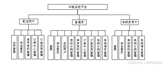 根据需求分析的结果,可以将冷链监控平台的功能划分为不同的模块。该系统主要可以划分为配送用户、车辆员用户和管理员三大模块,每个模块负责实现特定的功能,又可细分不同子模块,并与其他模块进行协作。本冷链监控平台的功能结构图如图4.6所示。