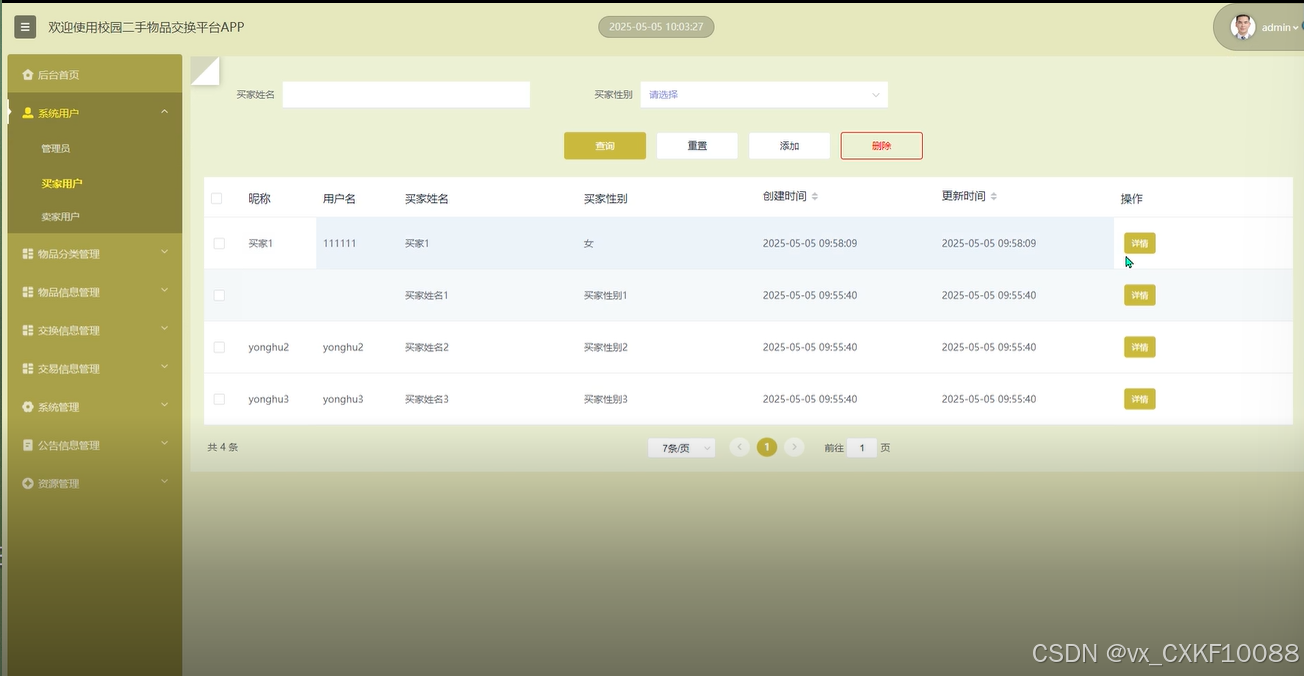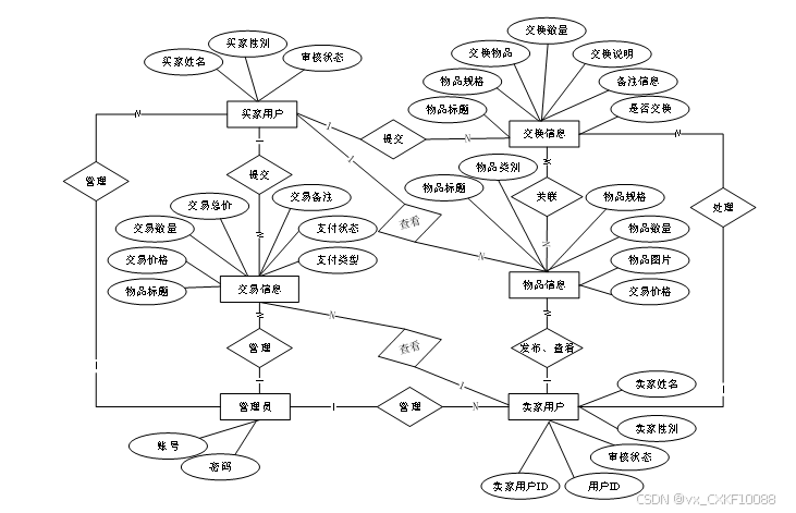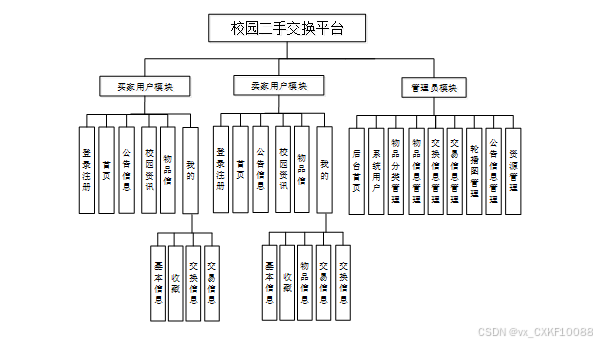 The platform's functions are divided into three main modules: buyer users, seller users, and administrators. Buyer users can browse item information, post exchange or transaction requests, like, comment, bookmark items, and view their transaction records and exchange information in their personal center; In addition to the functions of buyer users, seller users can also post item information, manage exchanges and transaction requests; Administrators are responsible for the backend management of the platform, including user management, item classification management, exchange and transaction information management, announcement publishing, etc., to ensure the normal operation of the platform and the security of information.