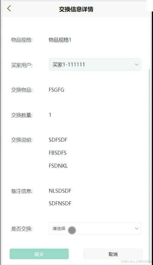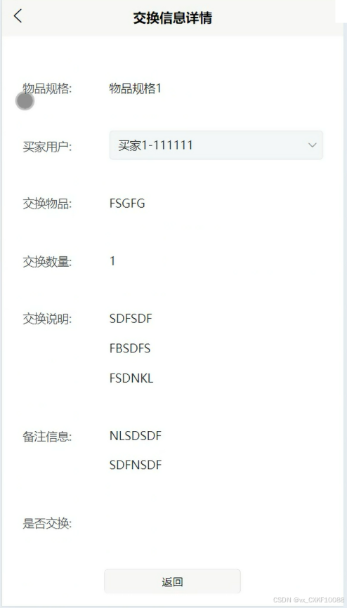 卖家用户点击“我的-交换信息”,可以查看买家发布的交换信息,根据物品的需求选择是否进行交换。交换信息详情界面如下图5-15所示。