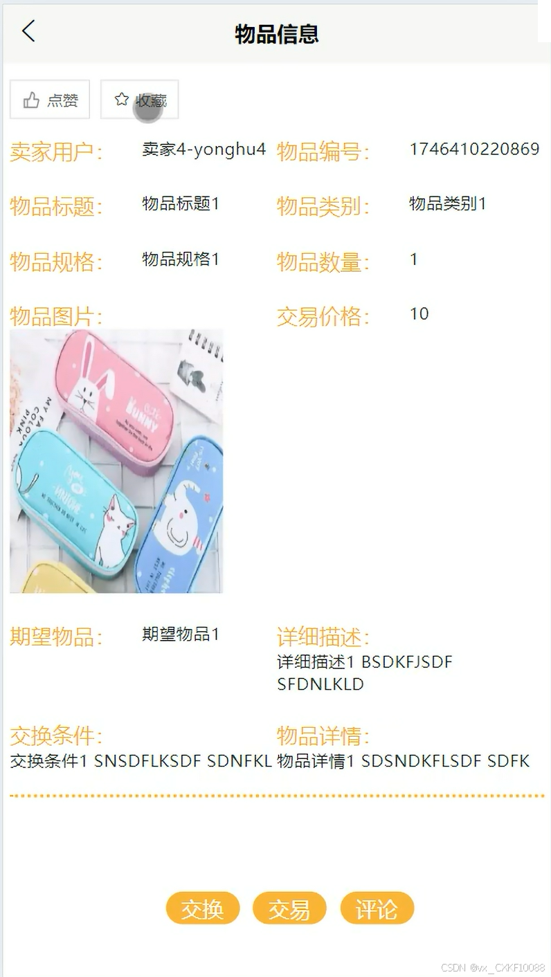 物品信息:卖家能够浏览平台上的所有物品信息,进行点赞、收藏、评论等互动操作。