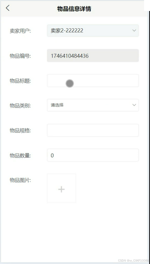 卖家用户点击“我的-物品信息”,可以发布自己的二手物品,输入详细的物品描述、上传图片、设定价格等。发布后,物品信息将展示给平台的所有用户,接受他们的浏览和互动。物品信息发布界面如下图5-14所示。