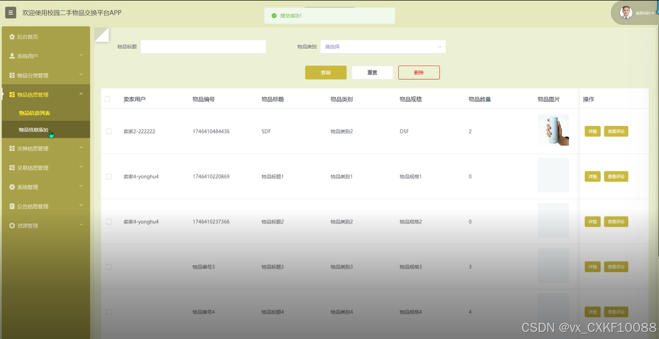 物品信息管理:管理员能够对所有平台上的物品信息进行审核与管理。管理员可以删除违规物品、修改物品信息或处理用户举报的物品,确保平台上的商品合法、合规且真实可靠。