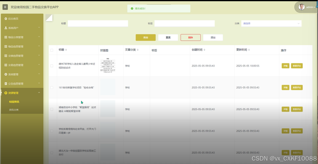 资源管理:管理员可以管理校园资讯栏目,发布校园新闻、活动通知等信息,并进行资讯的分类管理。通过这种方式,平台可以提供丰富的校园资源,增加用户粘性。