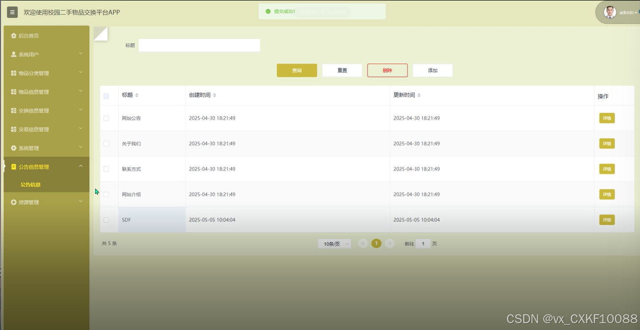 交换信息管理:管理员可以查看并管理所有用户发布的交换信息。管理员的职责是确保交换信息的合法性和有效性,处理异常或违规的交换请求,保持平台内容的健康性。