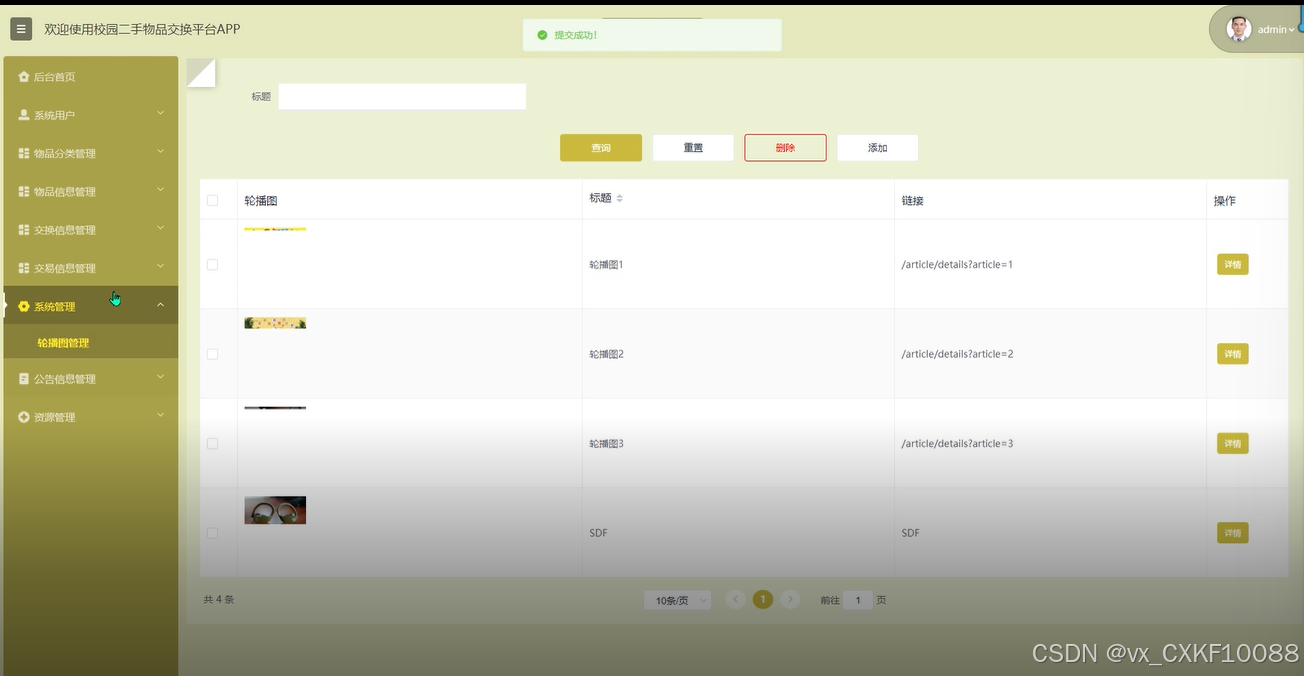 轮播图管理:管理员可以管理首页轮播图的内容,更新平台的宣传、活动信息或推广内容,提高平台的活跃度和吸引力。