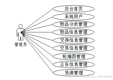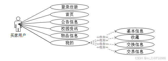 平台的功能分为三个主要模块:买家用户、卖家用户和管理员。买家用户可以浏览物品信息、发布交换或交易请求、点赞、评论、收藏物品,并在我的查看自己的交易记录和交换信息;卖家用户除了具备买家用户的功能外,还可以发布物品信息,管理交换与交易请求;管理员则负责平台的后台管理工作,包括用户管理、物品分类管理、交换与交易信息管理、公告发布等,确保平台的正常运行和信息的安全。