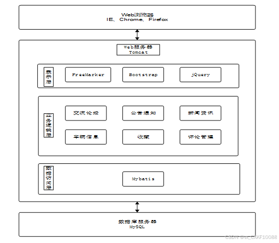 系统由表现层、业务逻辑层、数据访问层和数据库服务器组成。表现层通过浏览器(如IE、Chrome、Firefox)与用户交互,采用FreeMarker、Bootstrap、jQuery等技术实现界面呈现。业务逻辑层负责处理系统的核心业务逻辑,通过分模块设计实现功能分离。数据访问层使用MyBatis框架连接数据库,执行数据的增删改查操作。数据库服务器采用MySQL进行数据存储和管理,为系统提供稳定的数据库支持。整个架构通过Tomcat服务器完成用户请求的接收和处理,确保系统的高效运行[9]。整个系统架构如图4-1所示。