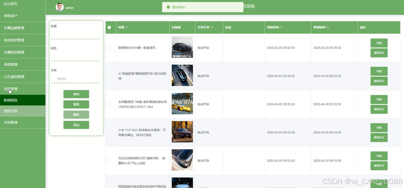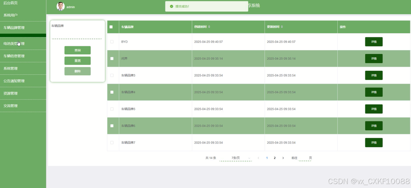 4.车辆品牌管理:管理员能够新增、编辑和删除新能源汽车品牌,并管理品牌列表,确保平台上的品牌信息始终准确、更新及时,满足用户需求。