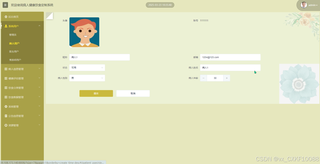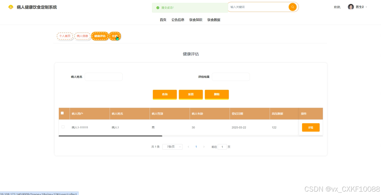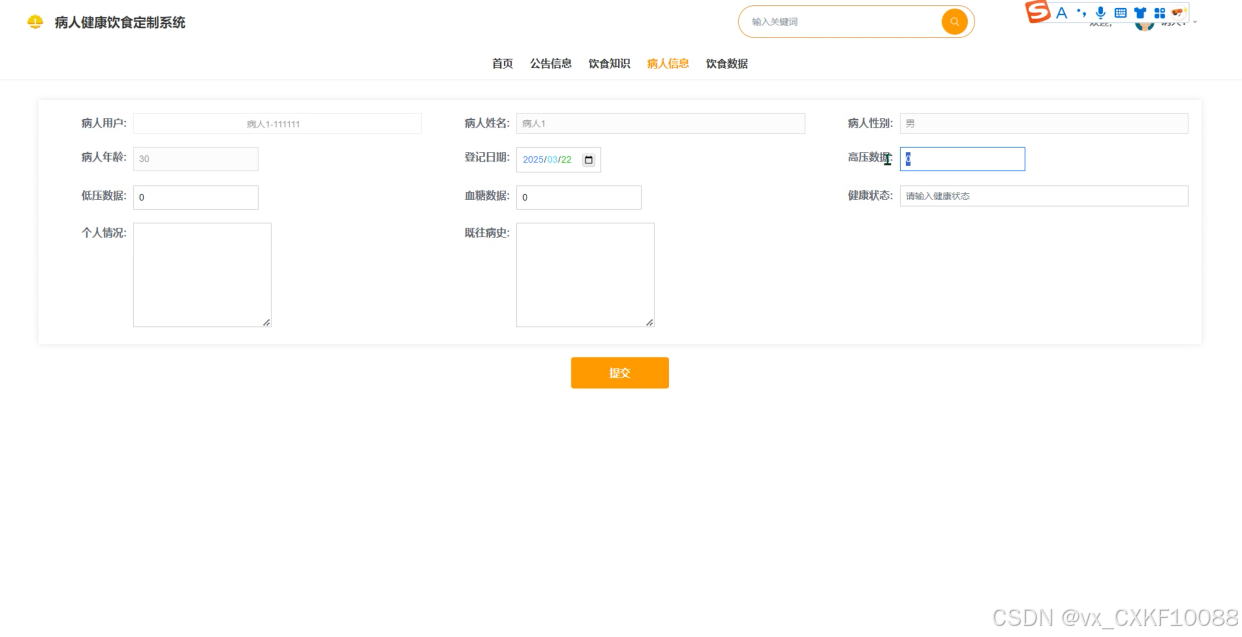 病人信息:允许病人录入并更新个人健康数据,如血压、血糖等,便于医生进行健康评估。