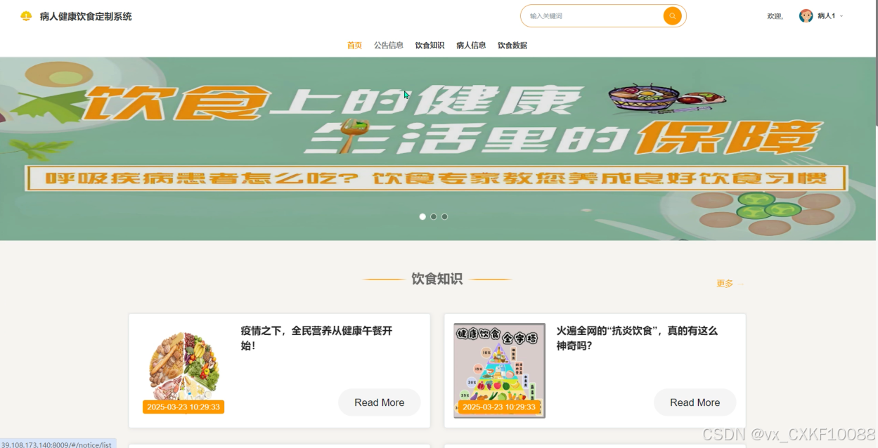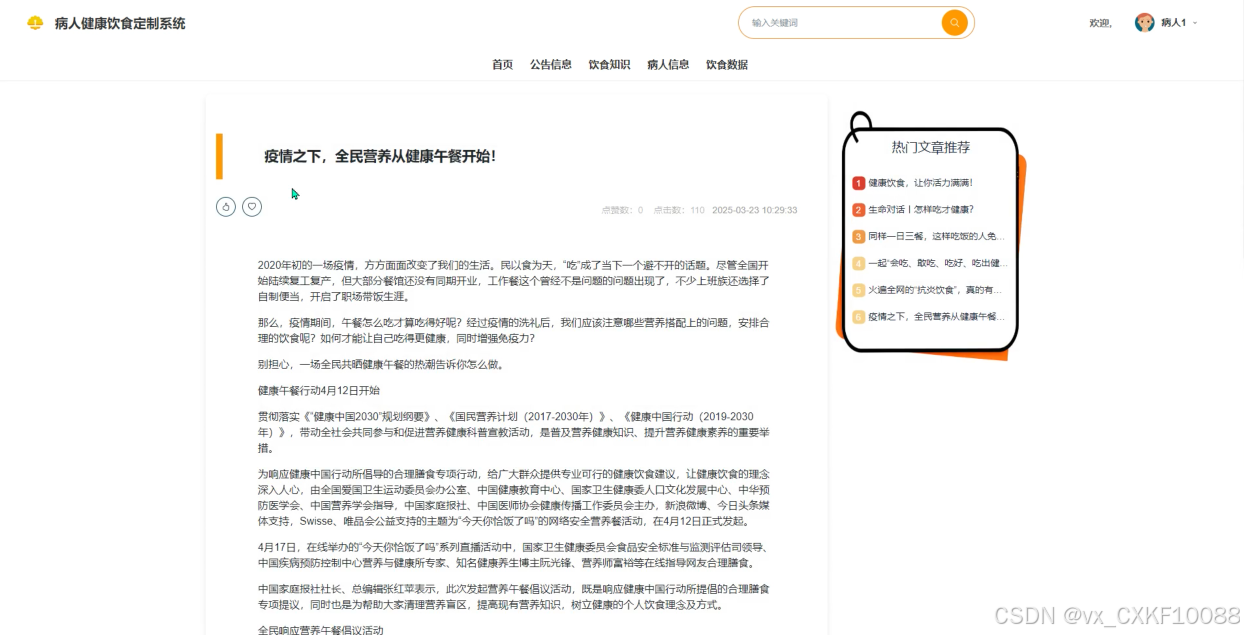 首页:展示根据用户偏好和健康状况定制的个性化饮食推荐,帮助病人快速获取适合自己的饮食方案。