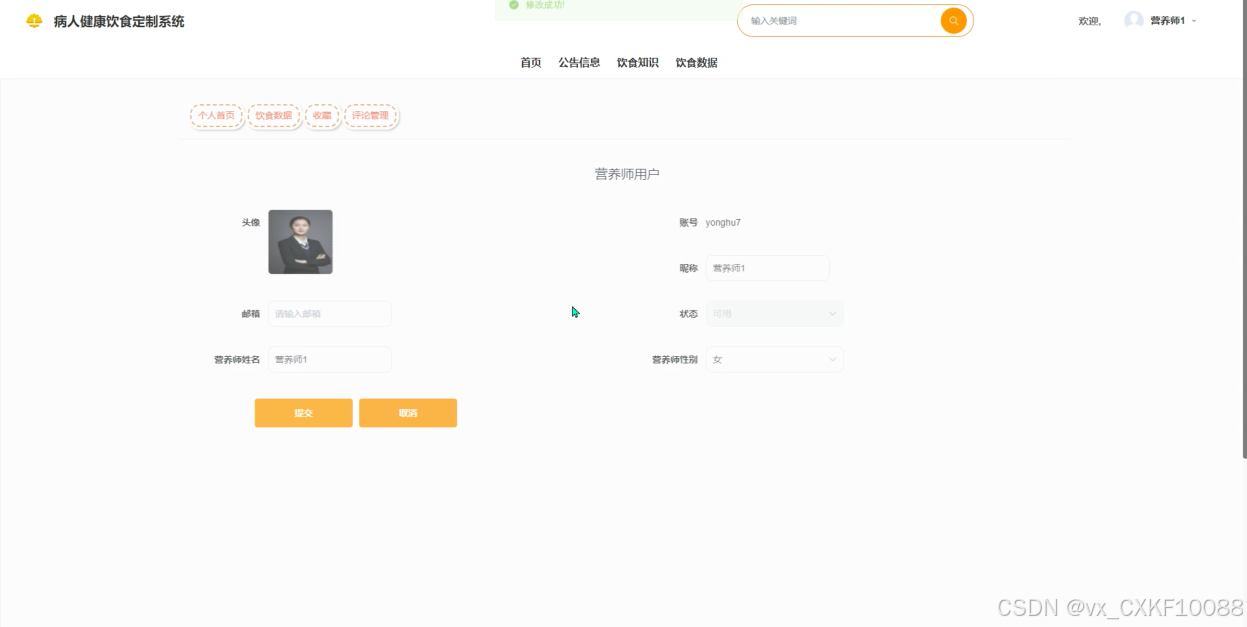 个人中心:集中管理和查看所发布的饮食内容、病人的反馈及评论,支持营养师对饮食方案进行优化调整,并管理收藏的内容以便快速访问。