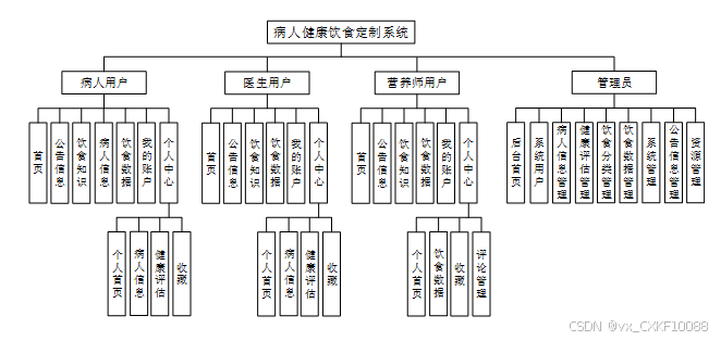 本病人健康饮食定制系统设计分为四大主要用户角色:病人用户、医生用户、营养师用户和管理员。以下是对每个角色的功能需求的详细描述。