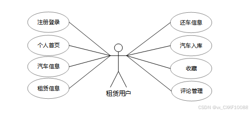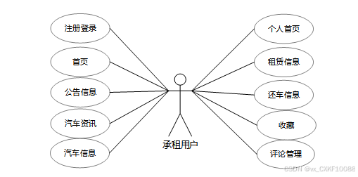 承租用户可以通过系统浏览各类可租赁汽车,查看详细的汽车资讯和公告信息,并进行租赁申请。个人中心提供了便捷的租赁管理功能,包括查看租赁记录、还车状态、收藏喜爱的汽车以及管理评论等。承租用户角色用例如下图所示。
