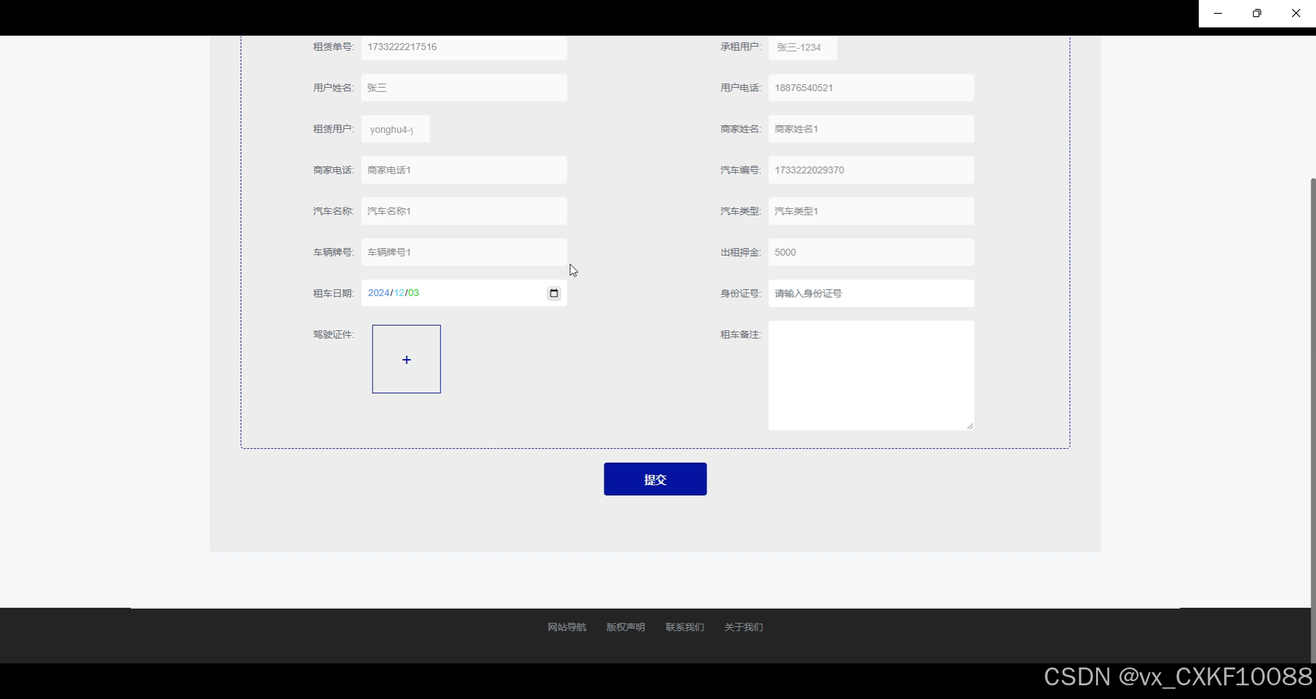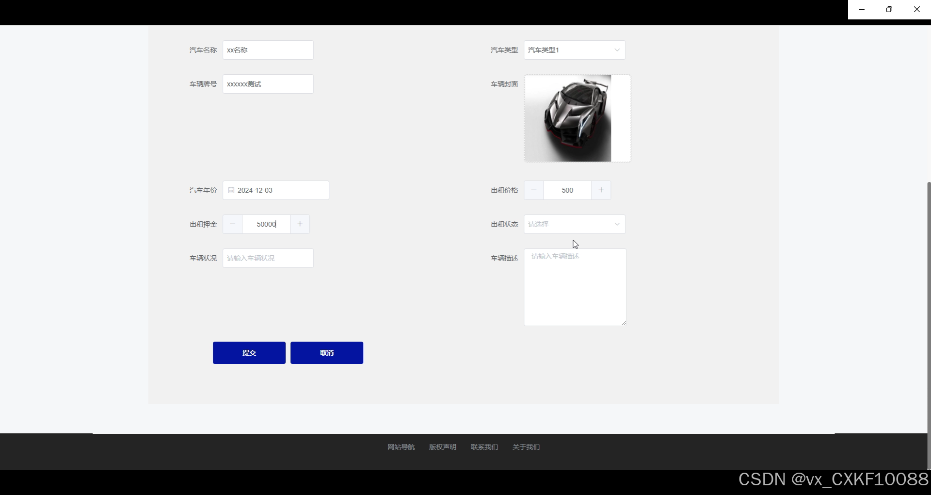 在添加可出租汽车时,CarAddController负责接收用户提交的信息,并调用CarAddService层的addNewCar方法将新车辆信息存入数据库。前端页面使用Vue.js表单组件收集车辆详情(如型号、租金、可用时间段等),用户填写完毕后点击提交按钮,系统验证数据完整性并提示成功与否。界面图如下所示。