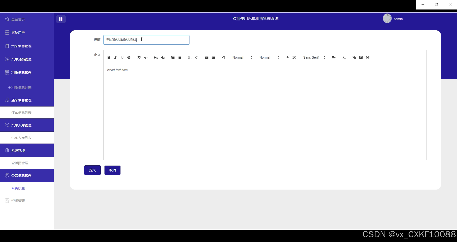 汽车信息管理:管理员可以通过系统高效地添加、编辑和删除汽车信息,并对车辆进行分类管理,确保信息的准确性和及时更新,为用户提供最新的汽车租赁选择。