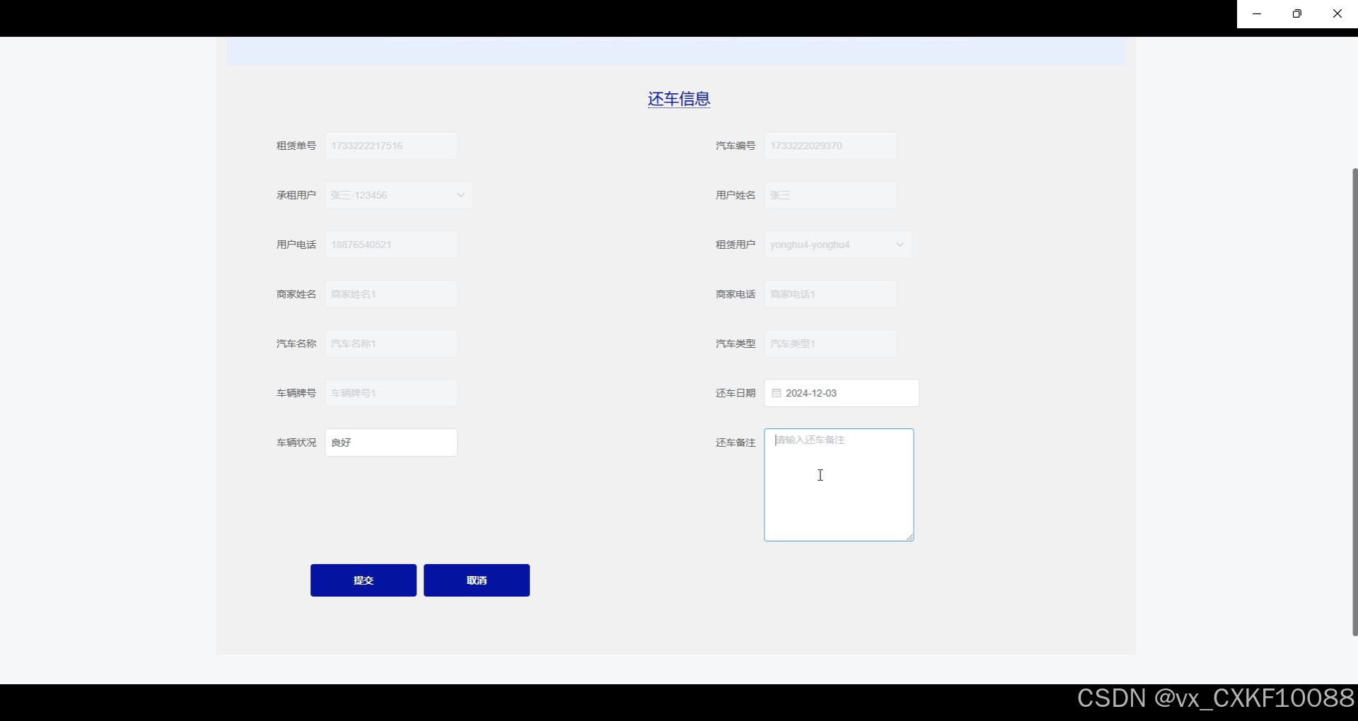 With the development of the sharing economy, the demand for car rental market is increasing day by day. In order to meet the needs of users for convenient car rental and improve the efficiency of rental management, it is particularly important to develop an Internet based car rental management system. The system is divided into three main roles: tenant, tenant, and administrator. Tenants can browse car information, view announcement information, rent cars, and manage personal rental records; Rental users can add rental cars, review rental applications, manage return information, etc; Administrators are responsible for comprehensive management of various information in the system, including user management, vehicle classification management, and announcement information release.