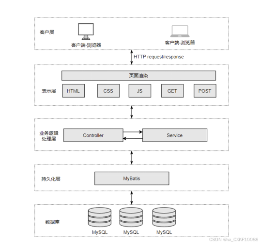 系统基于SpringBoot框架进行开发,整体架构分为VIEW层、Controller层、Model层、DAO层以及数据持久化层。VIEW层支持通过计算机浏览器访问系统,与Controller层密切协作,共同实现前端页面的数据展示。Controller层作为控制层,负责接收前端发送的请求参数并进行业务逻辑处理,随后返回相应的路径或数据。Model层则主要承担服务层的功能,负责业务逻辑的处理与执行。DAO层及持久化数据存储层则专注于与数据库的交互,确保数据的持久化存储。整个系统架构如图4-1所示。