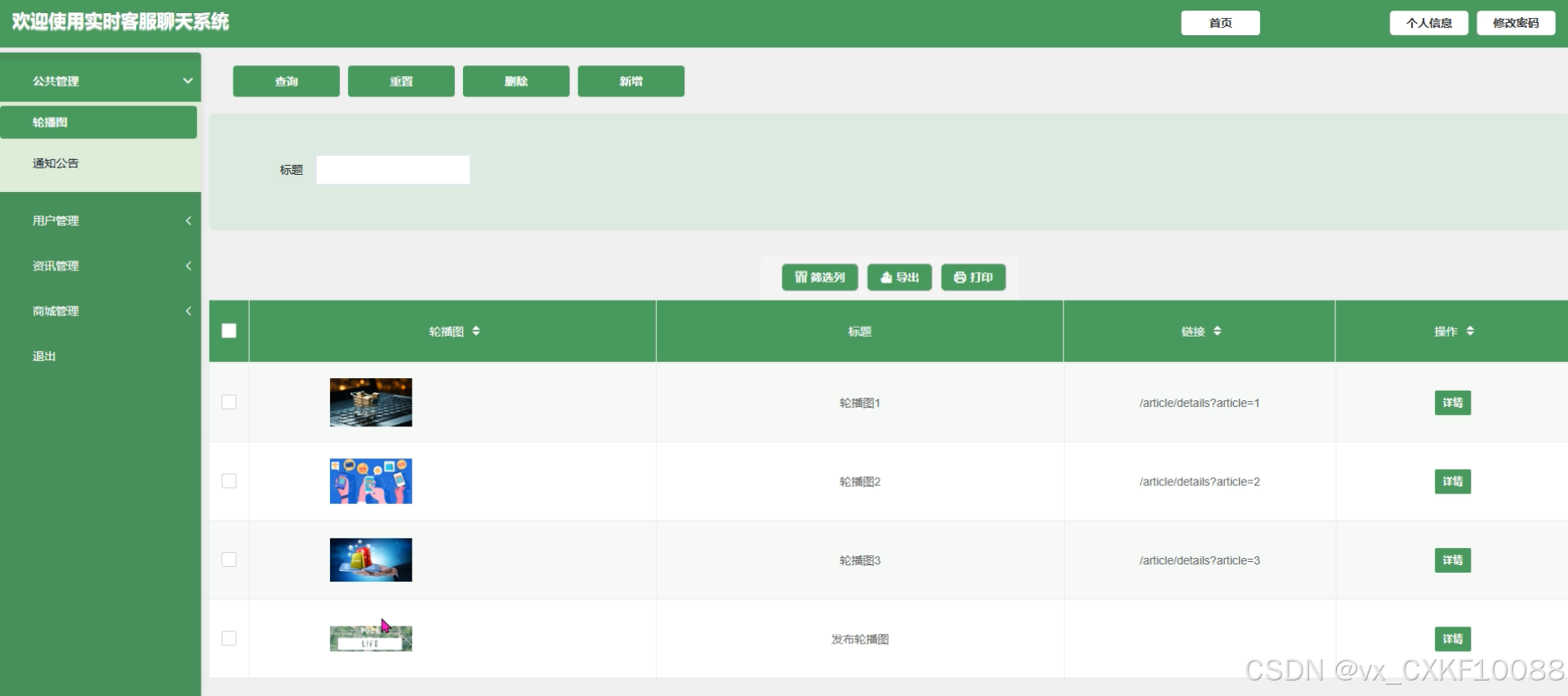 公共管理:管理员可以对系统轮播图进行详细管理,进行信息的增删改查操作,确保系统的正常运行与维护。管理员还可以管理平台的通知公告,包括查看详情、增删改查等操作,确保平台信息的及时更新。