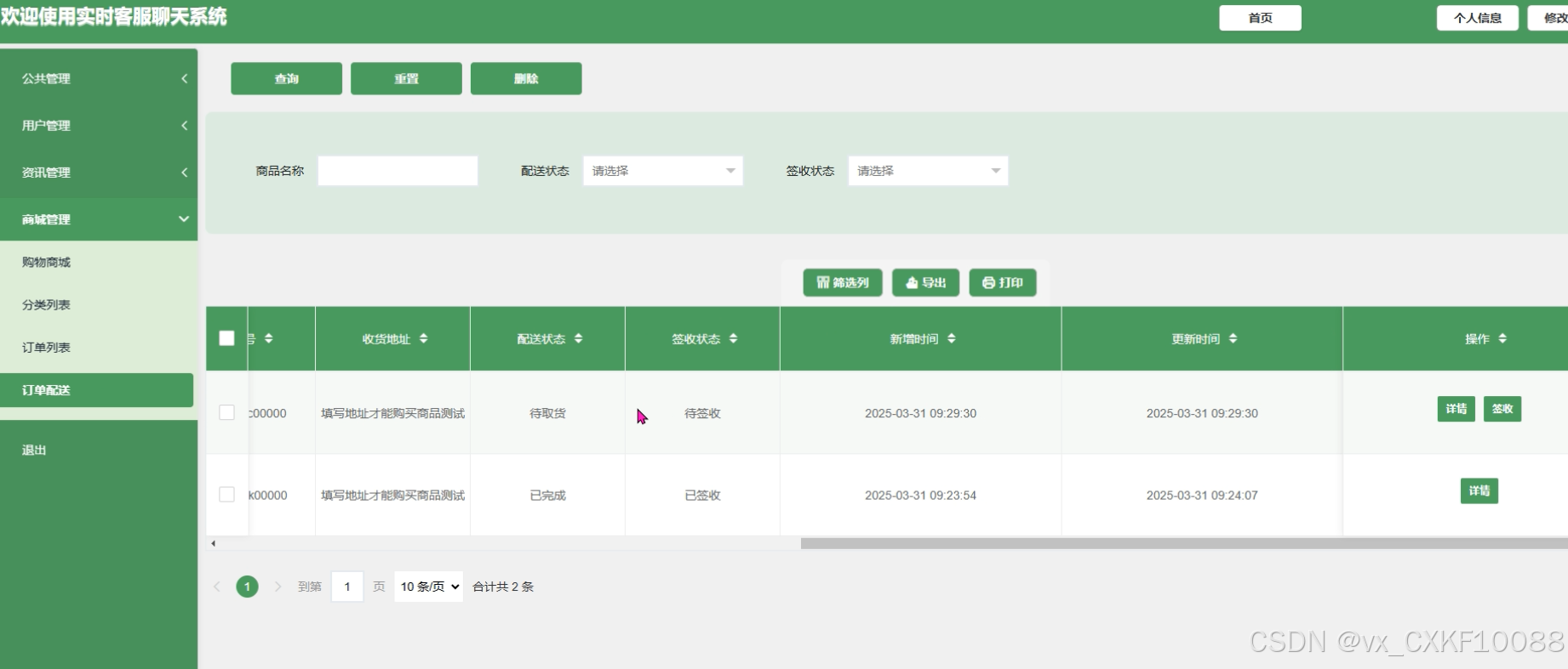 订单配送:用户可以查看订单配送的详细信息,并进行签收操作,支持搜索、查询、重置等功能。