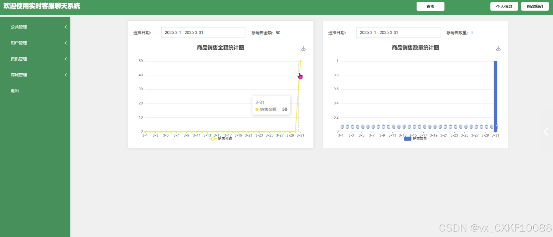 后台首页:管理员在后台首页查看商品销售金额和数量的统计数据,并可以修改个人资料和登录密码,方便管理平台。