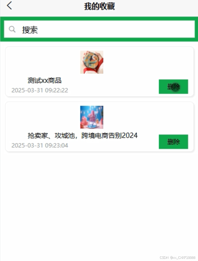 收藏:用户可以查看自己收藏的商品、资讯等内容,对不喜欢的内容进行删除。收藏功能让用户方便管理喜欢的商品与信息。