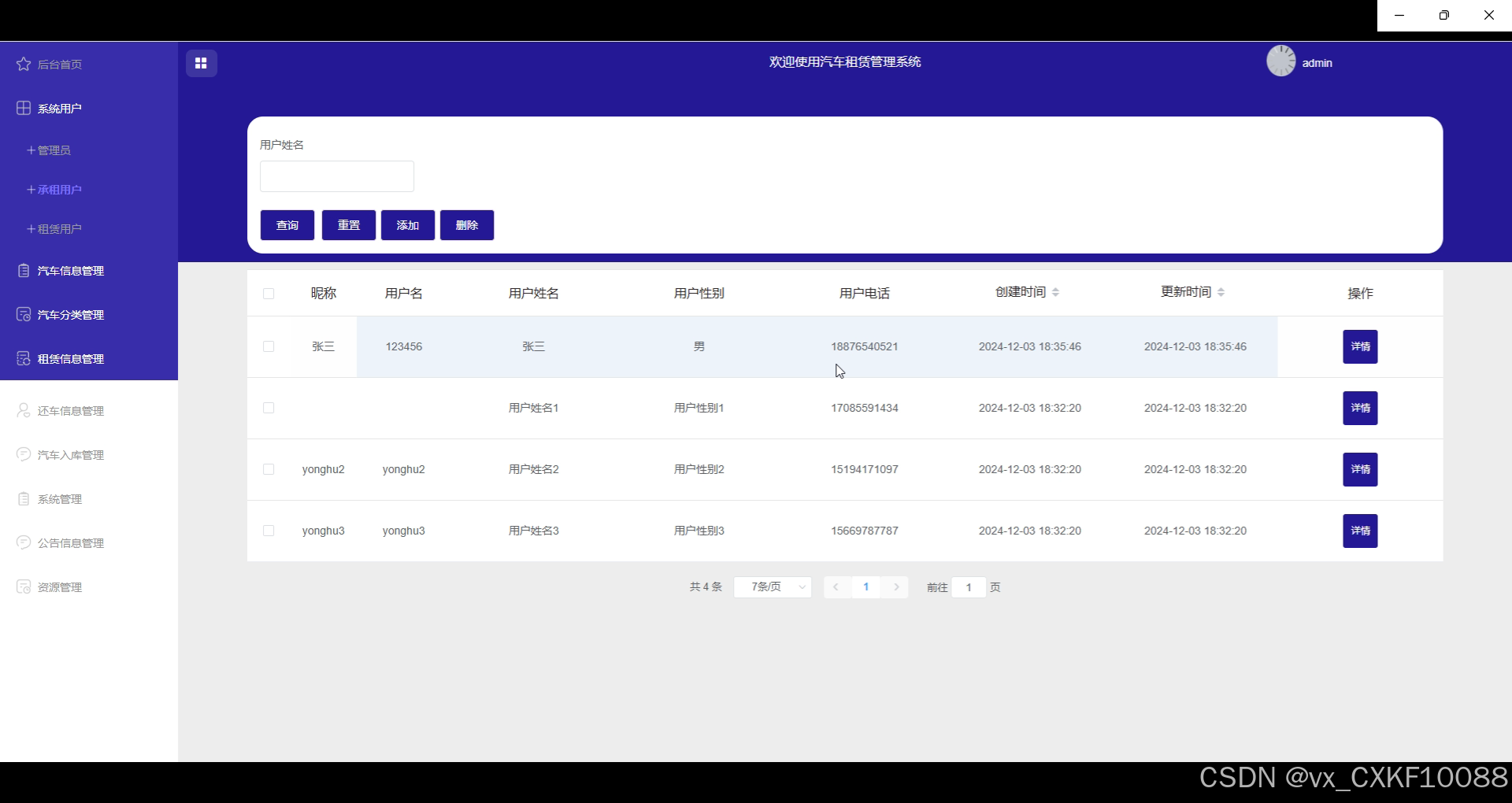 With the development of the sharing economy, the demand for car rental market is increasing day by day. In order to meet the needs of users for convenient car rental and improve the efficiency of rental management, it is particularly important to develop an Internet based car rental management system. The system is divided into three main roles: tenant, tenant, and administrator. Tenants can browse car information, view announcement information, rent cars, and manage personal rental records; Rental users can add rental cars, review rental applications, manage return information, etc; Administrators are responsible for comprehensive management of various information in the system, including user management, vehicle classification management, and announcement information release.