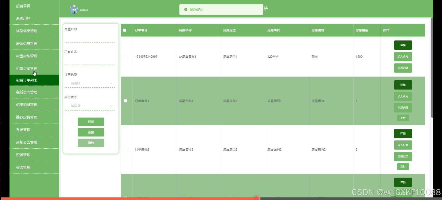 - 租赁订单管理:管理员可以查看租赁订单列表所有详情,录入合同、信用记录、查看支付状态等,可以进行增删改查操作。