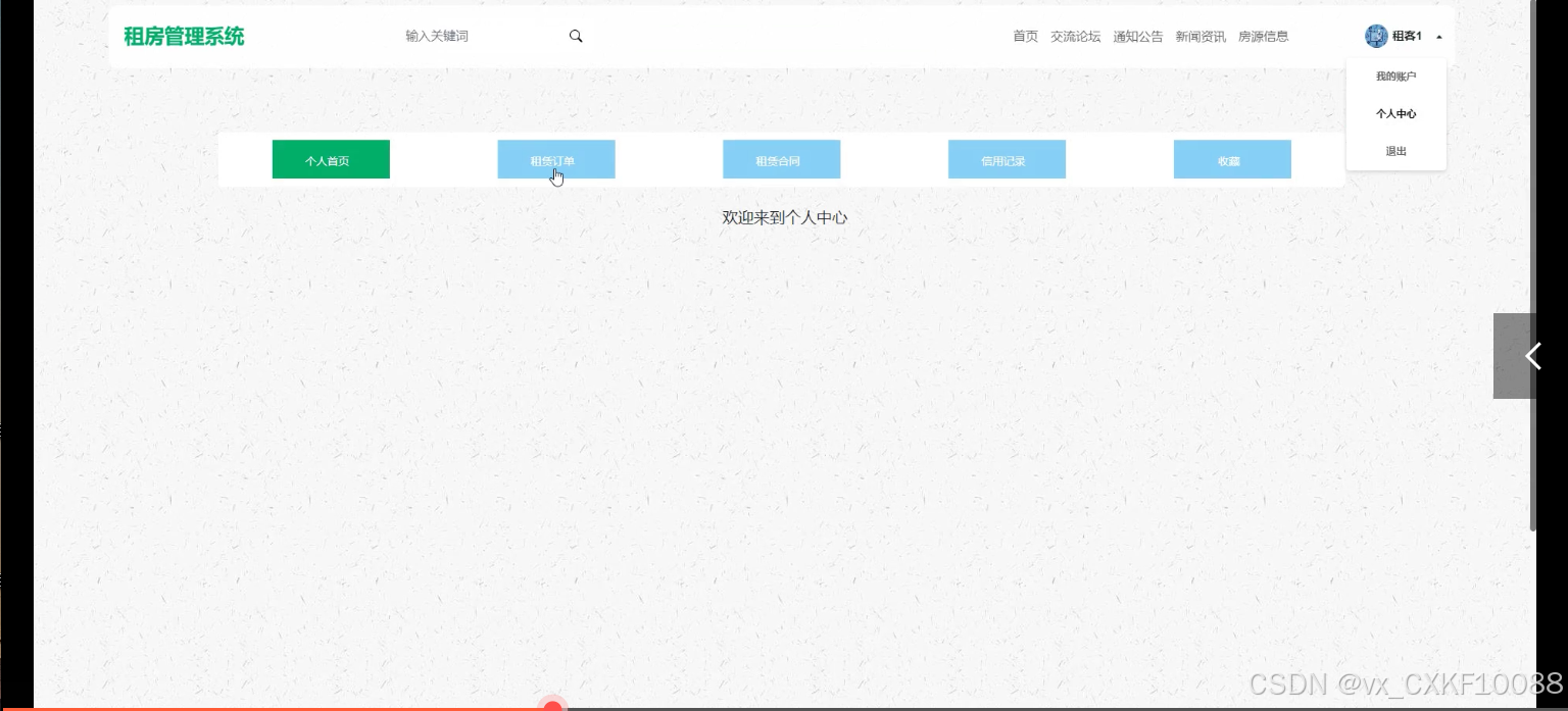 当用户点击右上角“我的”这个按钮,会出现子菜单,点击“个人中心”可以对首页、房屋申请、租赁订单、租赁合同、信用记录、收藏管理,个人中心界面如下图4-7所示。