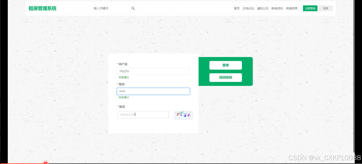 系统测试包括:用户登录功能测试、新闻资讯展示功能测试、房源信息添加、房源信息搜索、密码修改、预约看房功能测试,如表5-1、5-2、5-3、5-4、5-5所示:
