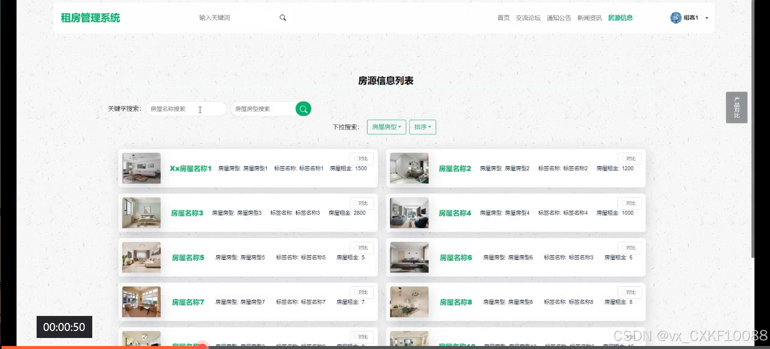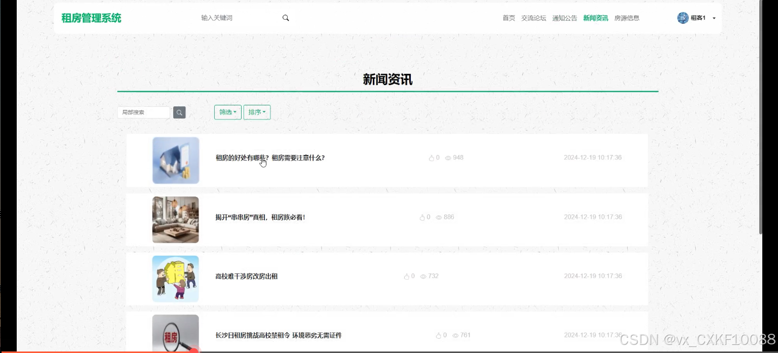 (2)首页:租房管理系统的首页信息包含了首页、交流论坛、新闻资讯、房源信息推荐等。