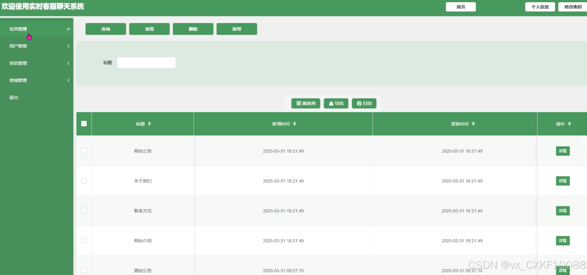 公共管理:管理员可以对系统轮播图进行详细管理,进行信息的增删改查操作,确保系统的正常运行与维护。管理员还可以管理平台的通知公告,包括查看详情、增删改查等操作,确保平台信息的及时更新。