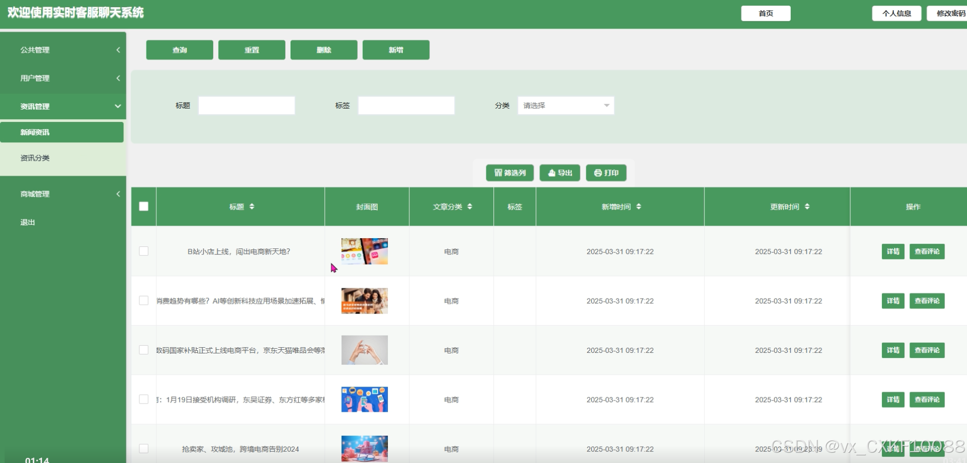 资讯管理:管理员可以管理新闻资讯的内容,包括查看修改详情、用户评论、进行增删改查等操作。资讯分类的管理也属于此功能,管理员可以对分类进行相关操作。